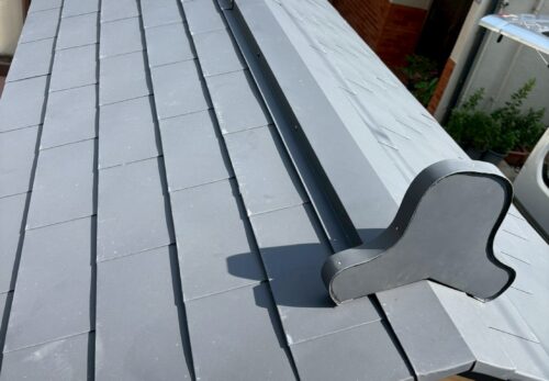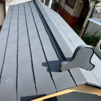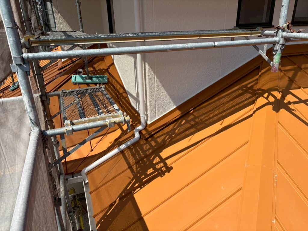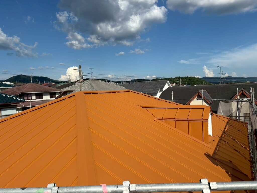 既存屋根はカラーベストでしたが、塗装より屋根を貼りかえたいと相談を受け、既存の屋根の上からカバー工法にて施工させて頂きました。材料はNIPPON STEELのニスクカラーProのオレンジ色を選んで頂きました。優れた耐久性があり変退色15年保証と遮熱機能もあり高耐久です。