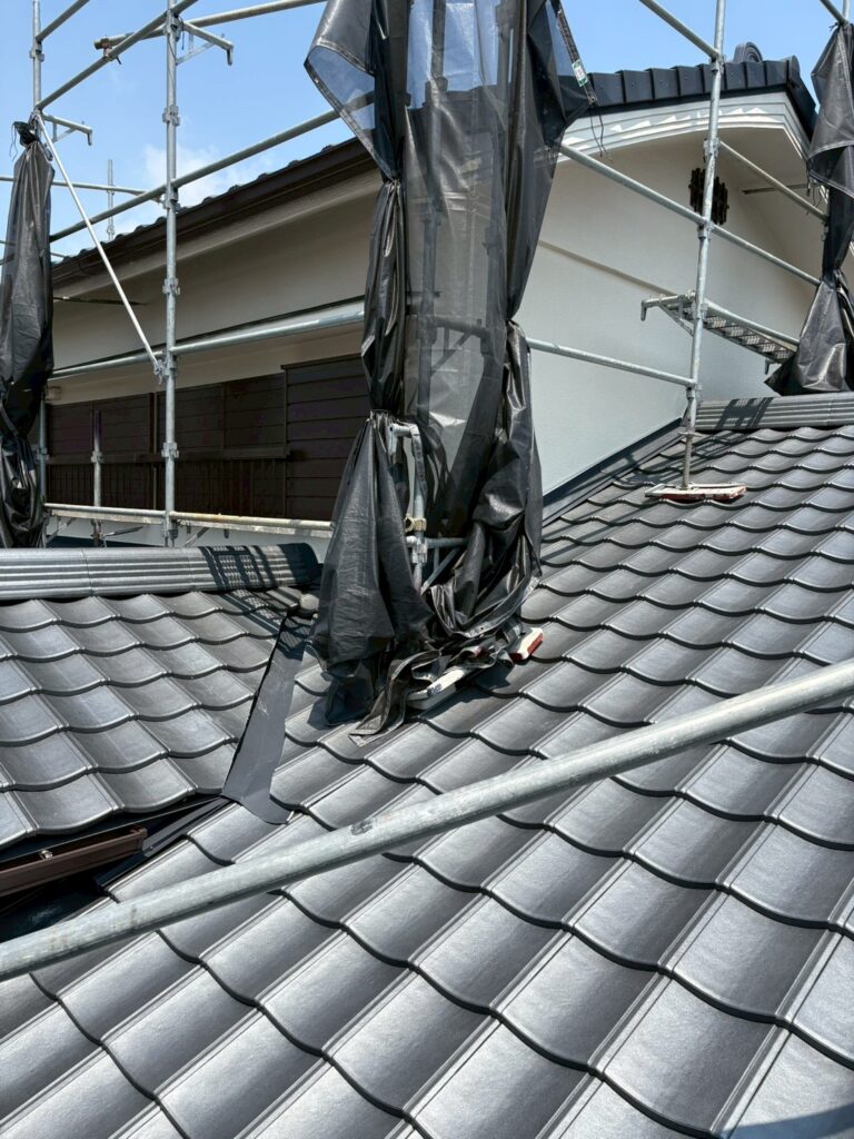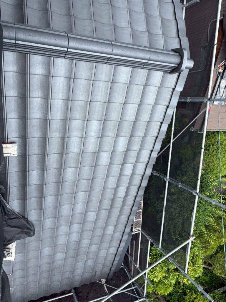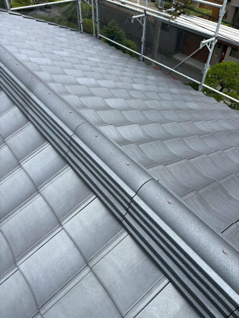 元は日本瓦でしたが、地震などを考え屋根の荷重を軽くしたいと相談を受け、重量感はありますが軽量のケイミュー ルーガー雅を選んで頂きました‼︎